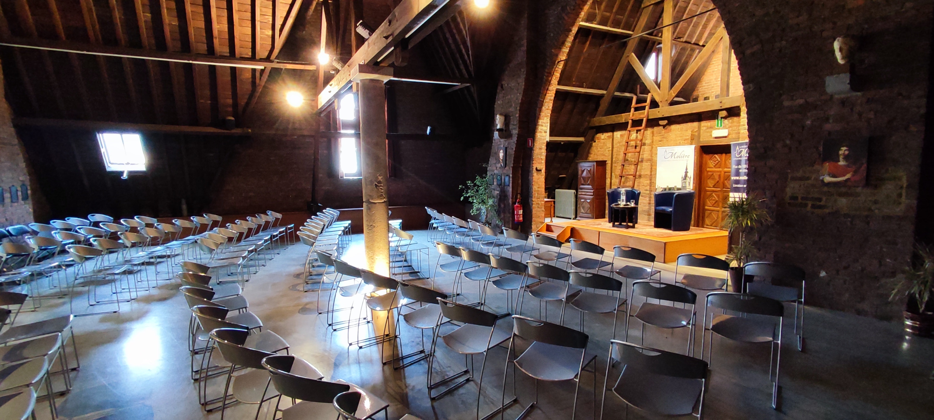 La librairie Molière dispose d'un magnifique grenier classé au patrimoine culturel de la région qui permet d'accueillir jusqu’à 200 personnes assises.